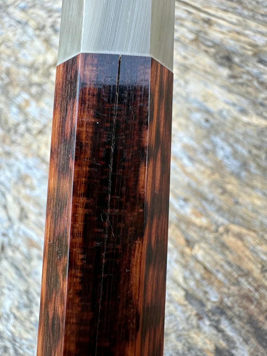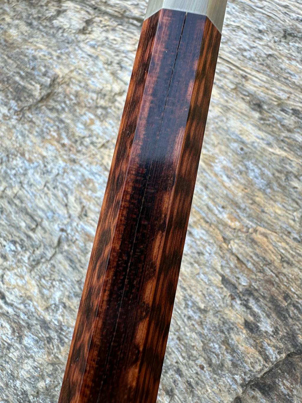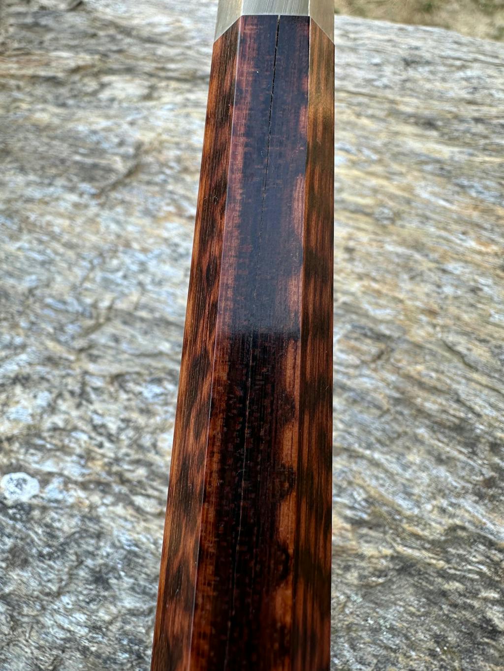 A traditional Japanese handle in an octagonal shape made from snakewood, with a blonde buffalo horn ferrule. Designed for both left- and right-handed users, it offers a balanced and comfortable grip.