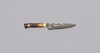 Saji Petty VG-10 130mm (5.1") definitivamente no es solo un atractivo visual. Si miras bajo el capó, ¡también encontrarás especificaciones increíbles! El núcleo de este cuchillo está hecho de acero VG-10, templado a alrededor de 61 HRC, y revestido en capas de acero inoxidable resistente a la oxidación, lo que le da a este cuchillo un patrón único de damasco.