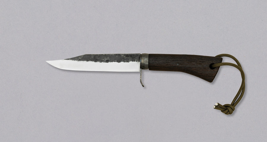 Le cœur de la lame est en acier Aogami (Blue Paper) Steel 2 de qualité supérieure, entouré de deux couches de fer doux (gokunantetsu). Cette construction san-mai (trois couches) garantit une netteté exceptionnelle et un entretien facile. Avec sa forme classique Bowie, le couteau est parfait pour les coupes précises comme pour les tâches lourdes. La texture martelée sur la lame ajoute une esthétique robuste et fonctionnelle.