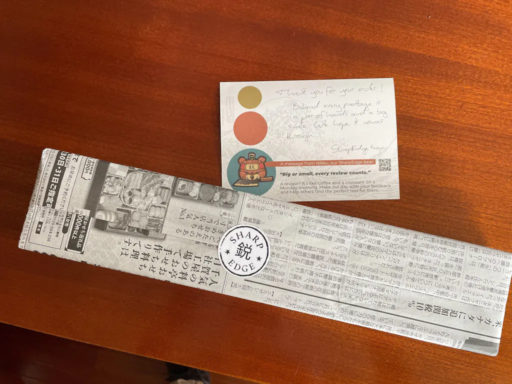 The knife is GORGEOUS, light, thin, razor sharp and, most importantly, feels great to cut with. I love it! Everything came packaged super well and secure and the shipping was even faster than expected.