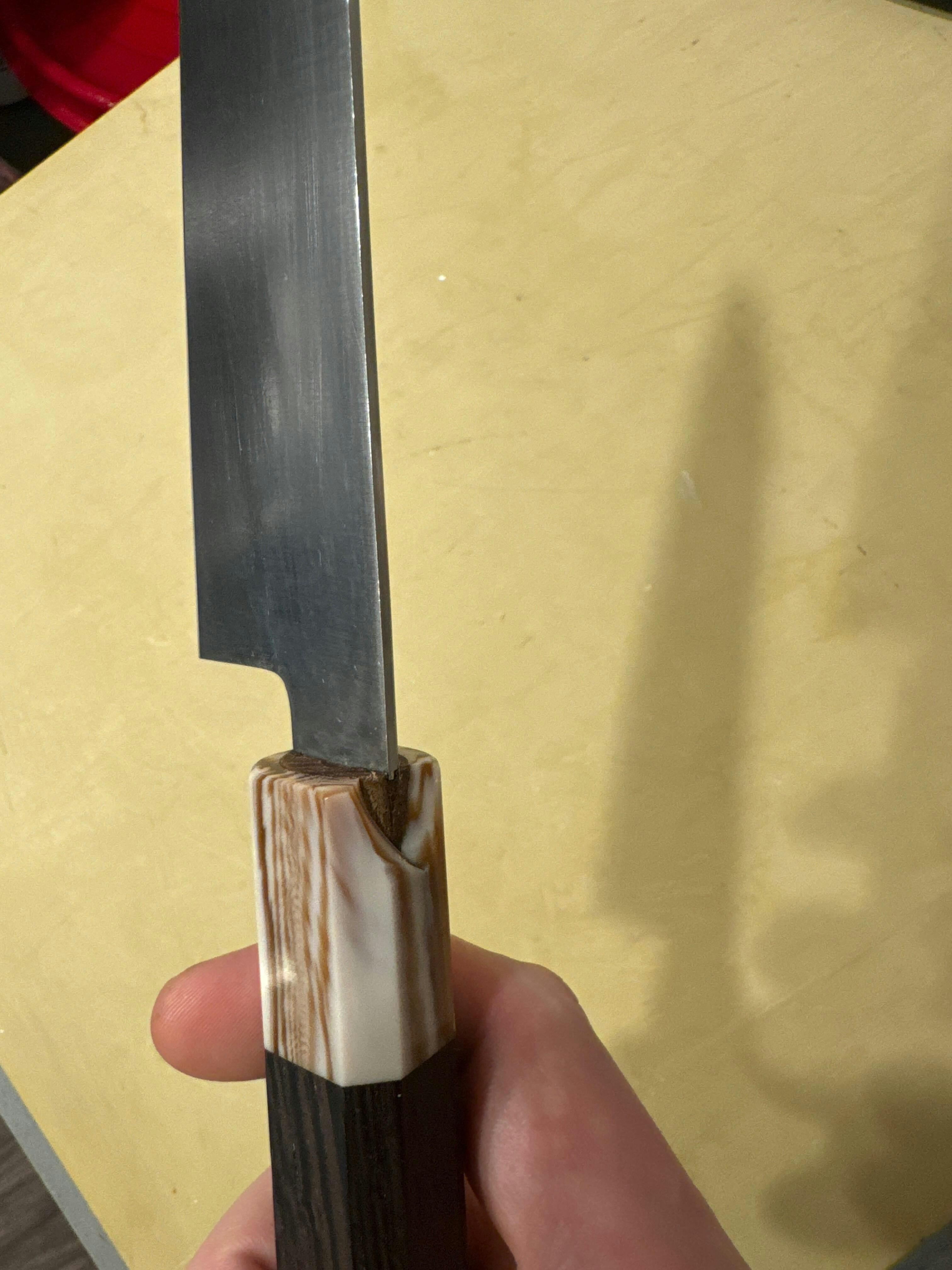 When I initially ordered this knife sharp edge shop accidentally sent me the regular gyuto version by mistake. Not a huge isssue, I reached out and explained and they offered me to return the knife and they would send the right one or keep it and get a 15% off coupon for a later purchase. I chose the coupon because I needed a knife at the time and it was just more convenient. The blade of the knife is great honestly, very easy to sharpen and holds a great edge. Unfortunately, that does not redeem the quality of the handle. From the very beginning, fresh from the box, the blade didn’t feel fully set into the handle. When moved back and forward, there was a slight give. Like it wasn’t glued in properly. I’ve never had this issue before so I didn’t think much of it but after 2-3 months of daily use a small crack began to form, which ultimately turned into a big chip that popped off of the epoxy, after only around 4 months of daily use in a professional kitchen. At this price point I really expected better, and it’s not that the knife is completely unusable at this point but working in a Michelin level environment, I just have a higher standard for my equipment than to continue using a knife with a big chip from the handle. It jus doesn’t feel sturdy or safe to use. Pretty disappointing and it 100% took this tool out of my daily use cycle.