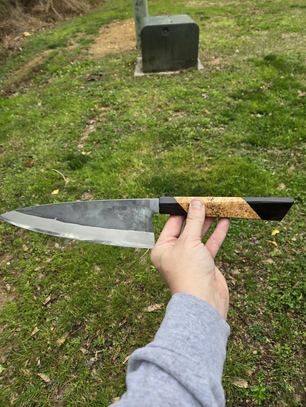 I mainly valued the wide profile since I enjoy the blade control it allows with a pinch grip, and scooping food comes naturally with the width. This blade and its grind has a very smooth transition from shinogi to tip, and slices with no friction as it moves through. Knowing it uses fancy steel with less reactivity is a plus in my view. Cannot recommend it more. Very unique.