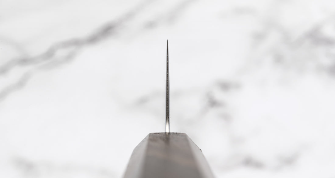 The knife features an octagon Japanese (Wa) style handle made out of bubinga wood. The octagon shape of the handle provides a comfortable and secure grip, allowing for precise control during use. Bubinga is a durable and dense tropical wood, known for its distinct brown color with dark patterns. Its strength and stability make it popular for crafting knife handles, furniture, and musical instruments. It has a beautiful texture and polishes well, giving it a smooth and elegant appearance.