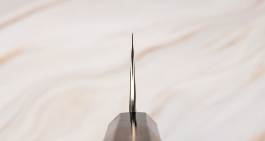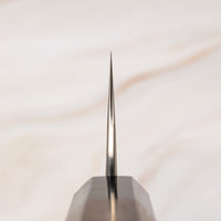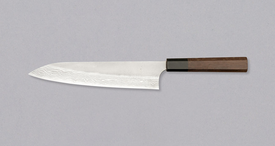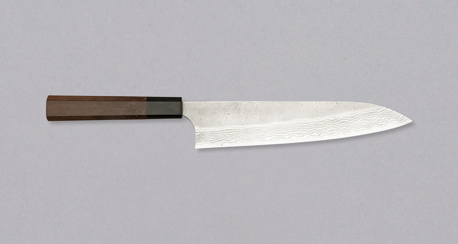 This mid-sized gyuto is a classic all-rounder—long enough for slicing proteins and large vegetables, yet nimble enough for precise prep work. The blade is ground extremely thin, allowing for accuracy even when working with delicate or small ingredients. Its slightly curved belly supports a smooth rocking motion.