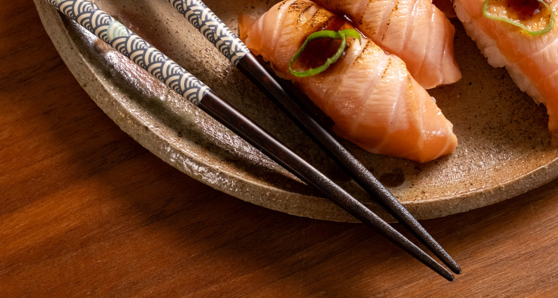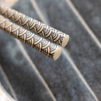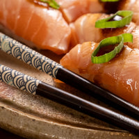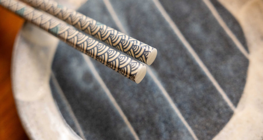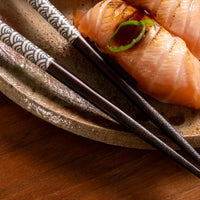 Savor traditional Japanese artistry with every bite. These square-grip chopsticks showcase the serene 'seigaiha' wave pattern flowing gracefully along each side. A timeless Japanese design, this pattern of overlapping concentric arcs, reminiscent of scales, symbolizes calm waves, peace, and tranquility.