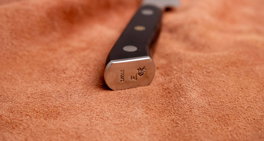 It has a double bevel (symmetrical) blade (50/50) with a hamaguri grind. The blade has a distal taper, meaning that the blane thins from the heel of the blade towards the tip. This gives it more strength and weight at the handle (meaning we can exert more pressure with the heel) and more precision at the tip, allowing for smooth and precise cuts.