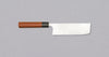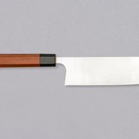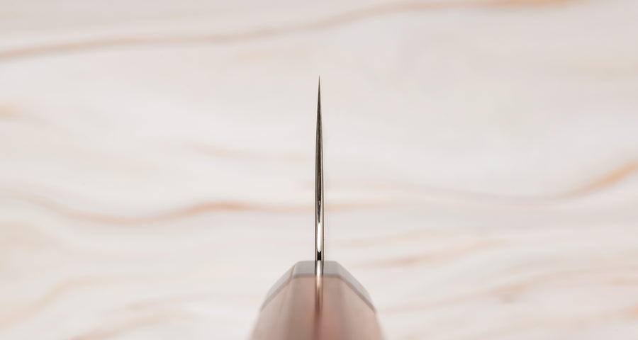 The knife features an octagon Japanese (Wa) style handle made out of rosewood, complemented by a pakka wood ferrule. The octagon shape of the handle provides a comfortable and secure grip, allowing for precise control during use.