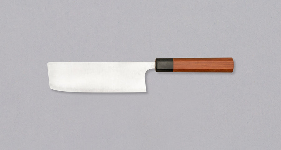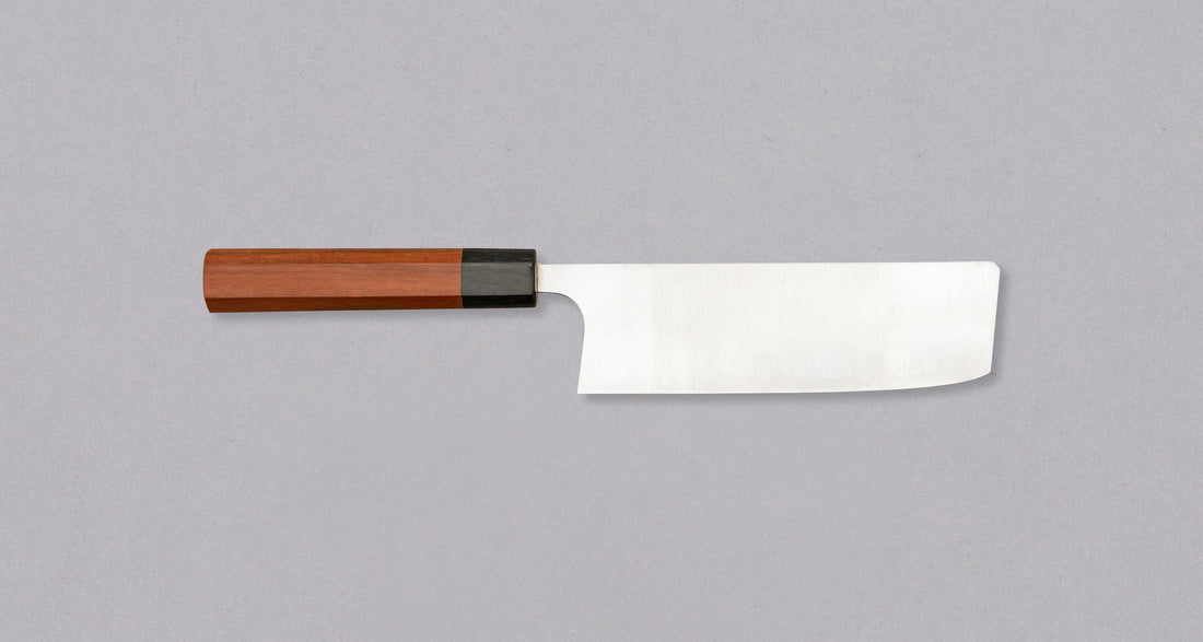 At 165mm (6.5"), this Nakiri is purpose-built for slicing and dicing vegetables with precision. Its flat edge profile is ideal for push-cutting and chopping through herbs, greens, or dense root vegetables. The blade is exceptionally thin behind the edge, meaning it glides effortlessly through food with minimal resistance.