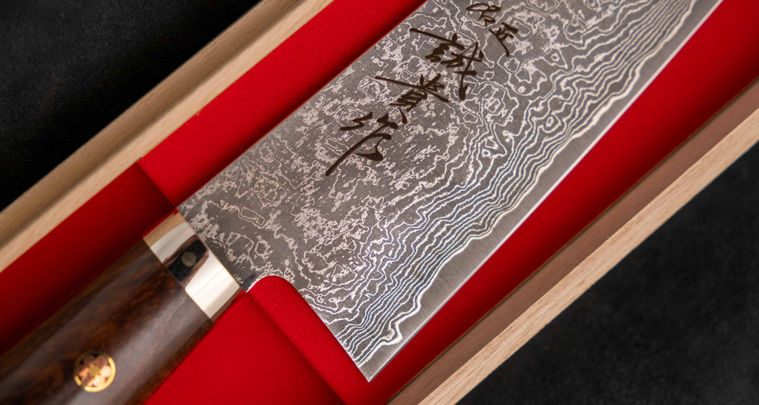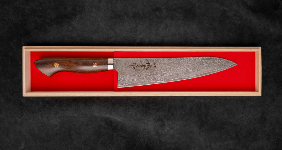 Presented in a traditional Japanese wooden box, the Tanaka SG2 Gyuto is more than a tool—it’s a collector-worthy blade designed to be used and admired