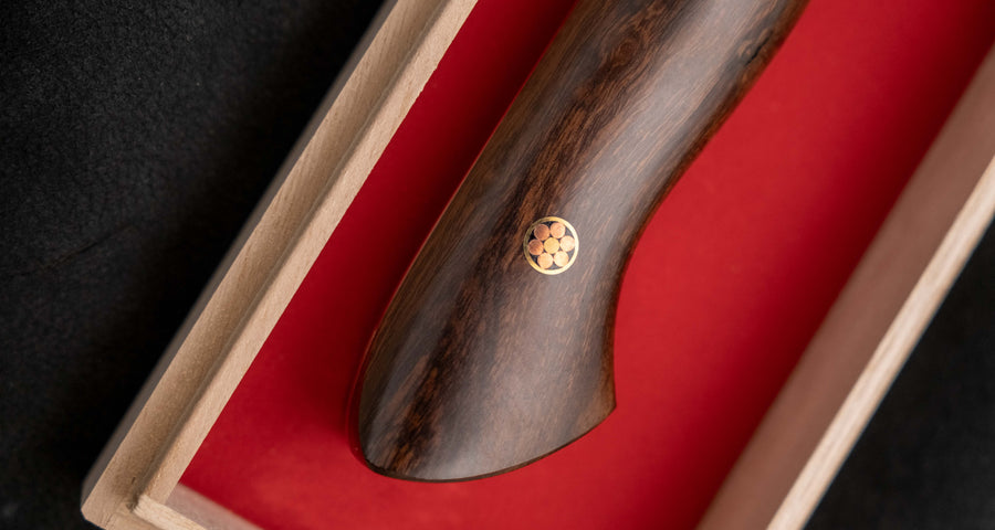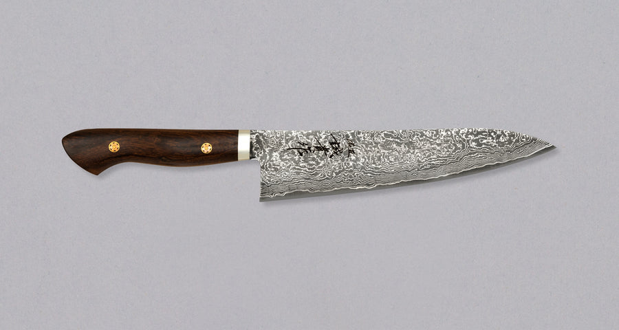 Not all knives are made to be passed down through generations. But this one is. Hand-forged by one of the most recognizable figures in modern Japanese knifemarking, master blacksmith Shigeki Tanaka, this gyuto is a rare top-of-the-line piece that combines impressive performance, craftsmanship, and aesthetics. The knife’s SG2 powder steel core is enveloped by 33 layers of beautifully etched, black-tinged Damascus, while the rich ironwood handle is secured with two elegant mosaic pins.