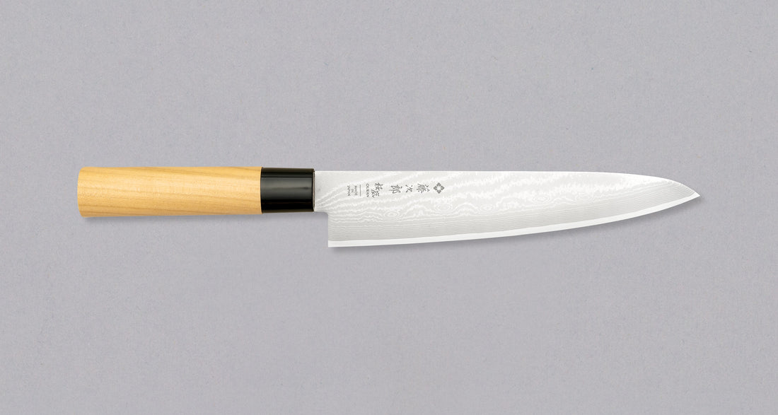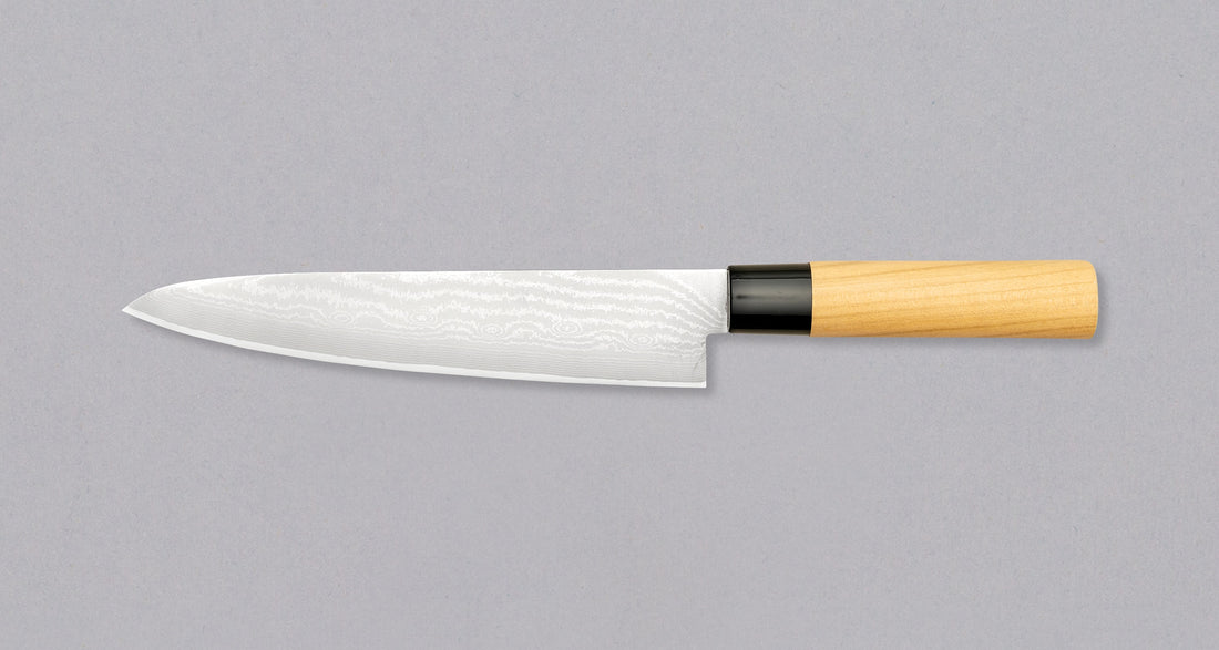 High-quality VG-10 steel (61 HRC) is clad in softer stainless steel, creating a distinctive Damascus pattern that makes each knife one of a kind.