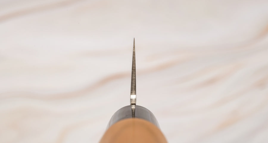 This knife features a double bevel (50/50 symmetrical), meaning the blade is sharpened symmetrically on both sides. That makes it equally comfortable for both left- and right-handed users and easier to maintain at home. It also allows for clean, controlled cuts—especially helpful for precise, consistent cuts—whether you're prepping quickly or taking your time.
