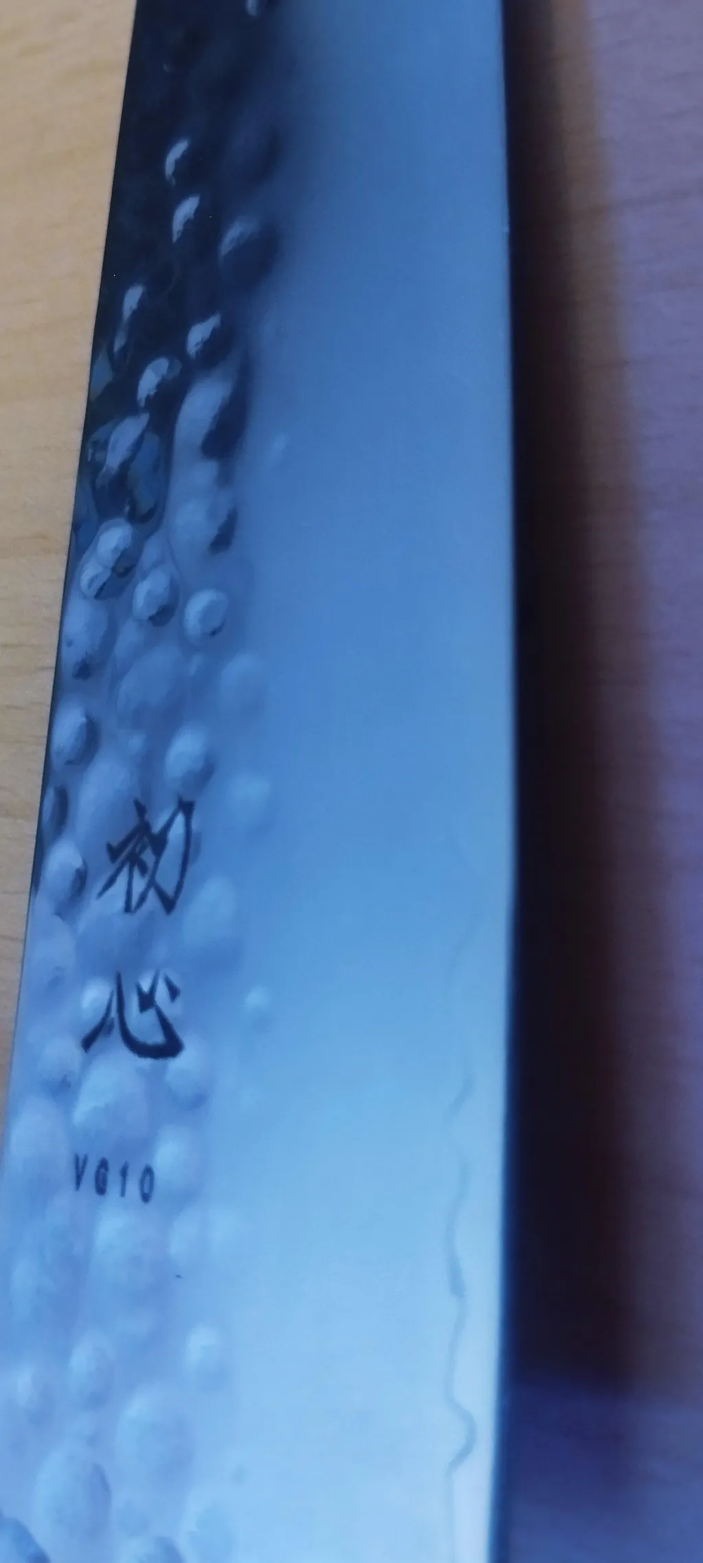 A lâmina apresenta um acabamento limpo, altamente polido em espelho (também chamado migaki). A superfície da lâmina foi tratada com um martelo texturizado especial, deixando impressões geométricas complexas na sua parte superior.